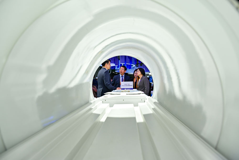 11月5日,人們在第七屆進(jìn)博會(huì)醫(yī)療器械及醫(yī)藥保健展區(qū)GE醫(yī)療展臺(tái)了解一款讀秒成像磁共振儀器。新華社記者 張鋮 攝