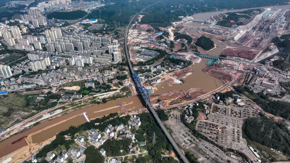 這是廣西平陸運(yùn)河青年樞紐與市區(qū)銜接處的建設(shè)工地(2024年10月11日攝,無(wú)人機(jī)照片)。新華社記者 張愛林 攝