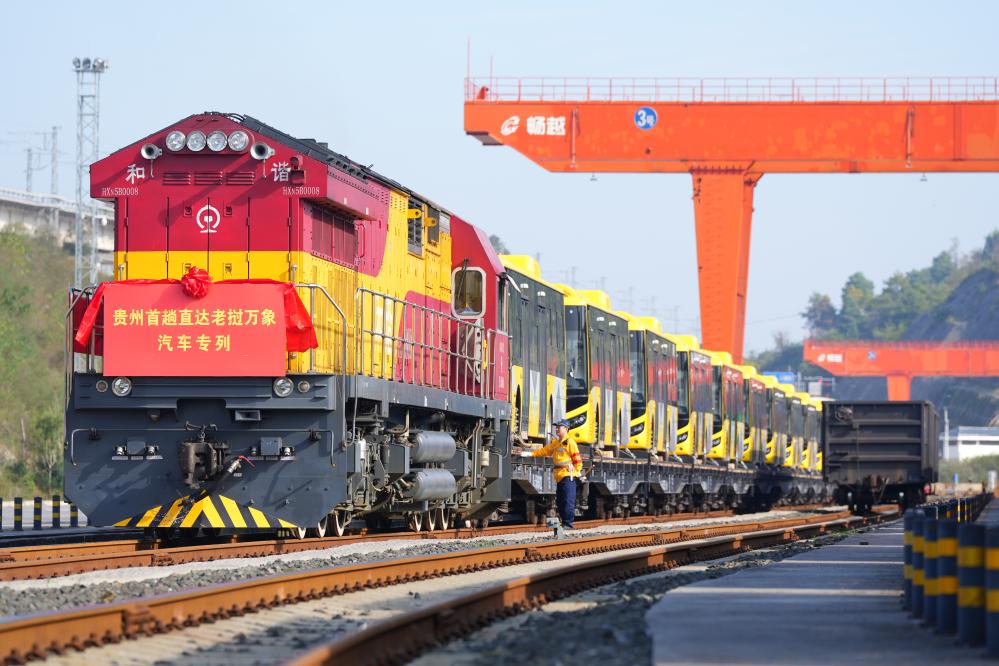 10月底,55臺(tái)“貴州造”新能源客車搭乘西部陸海新通道國(guó)際鐵路聯(lián)運(yùn)班列,從貴陽(yáng)國(guó)際陸港都拉營(yíng)站開出,不久后抵達(dá)老撾萬(wàn)象。