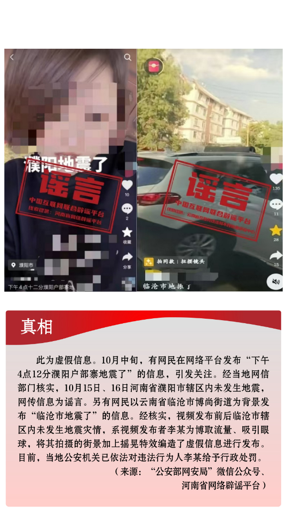危言聳聽(tīng)炒作話題。個(gè)別網(wǎng)民和自媒體編造虛假信息,炒作社會(huì)熱點(diǎn)話題,并配以具有煽動(dòng)性、誤導(dǎo)性的標(biāo)題,擴(kuò)散傳播,擾亂社會(huì)秩序。10月中旬,新疆喀什、阿克蘇地區(qū)相繼發(fā)生地震,部分自媒體罔顧事實(shí),利用AI技術(shù)拼湊網(wǎng)絡(luò)舊圖,編造完全與事實(shí)不符的地震廢墟或?yàn)?zāi)后救援圖片,混淆視聽(tīng),嚴(yán)重誤導(dǎo)網(wǎng)民。另有個(gè)別網(wǎng)民將拍攝的街景加上搖晃特效,惡意杜撰云南發(fā)生地震,引發(fā)公眾恐慌,造成不良影響。還有網(wǎng)民為給網(wǎng)店?duì)I銷(xiāo)引流,利用家長(zhǎng)們高度關(guān)注兒童安全話題的心理,無(wú)中生有編造“四川巴中頻繁有青少年失蹤”謠言,引發(fā)公眾焦慮恐慌。