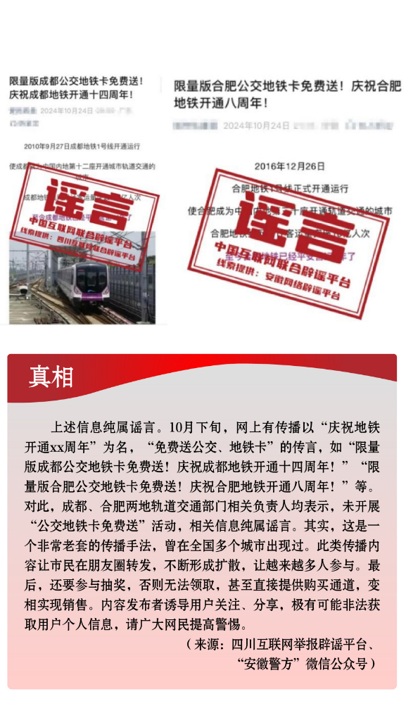 假冒官方虛構(gòu)政策。一些不法分子冒充權(quán)威機(jī)構(gòu),散布涉公共政策類(lèi)謠言,誤導(dǎo)公眾認(rèn)知。有的假借官方名義,偽造政策文件,實(shí)則行騙牟利,侵犯群眾利益。如有人利用公眾對(duì)“大數(shù)據(jù)”“數(shù)字經(jīng)濟(jì)”等內(nèi)容的認(rèn)知盲區(qū),假借“國(guó)家數(shù)據(jù)局”“中國(guó)人民銀行數(shù)字貨幣研究所”等官方名義,偽造政策文件,謠稱“國(guó)家數(shù)據(jù)局頒發(fā)‘個(gè)人數(shù)據(jù)資產(chǎn)擁有權(quán)確權(quán)憑證’”“數(shù)字人民幣平臺(tái)將發(fā)放‘?dāng)?shù)字資產(chǎn)紅利’”,相關(guān)部門(mén)均已發(fā)布辟謠聲明。有的從公開(kāi)發(fā)布的政策信息中摘取碎片化信息,斷章取義,對(duì)政策歪曲解讀。如個(gè)別自媒體故意混淆“個(gè)人養(yǎng)老金”與“基本養(yǎng)老金”的概念,傳播“領(lǐng)取養(yǎng)老金要繳3%個(gè)稅”“養(yǎng)老金個(gè)稅起征點(diǎn)為5000元”等不實(shí)信息,引發(fā)公眾誤解。另有“成都、合肥等地免費(fèi)送公交地鐵卡”謠言,以“免費(fèi)”“贈(zèng)送”為噱頭,誘導(dǎo)用戶關(guān)注、分享,最終可能導(dǎo)致用戶遭受個(gè)人信息泄露或其他不法侵害。