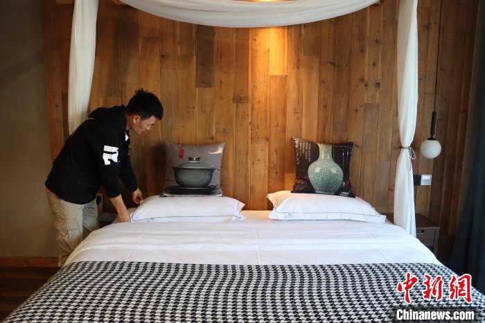 11月8日,浙江龍泉溪頭村,葉柏青打理充滿青瓷文化的房間。 周健 攝