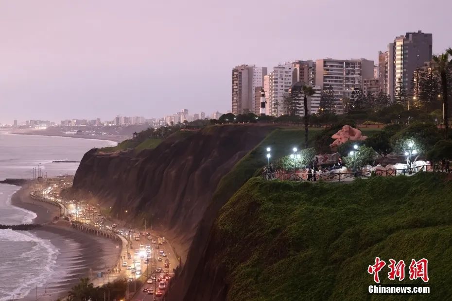 當(dāng)?shù)貢r間11月12日,秘魯首都利馬,日落時分的海岸線美景。中新社記者 盛佳鵬 攝