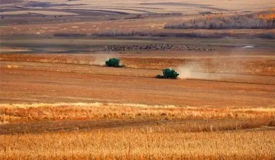 ▲ 大型收割機(jī)在進(jìn)行收割。莫旗融媒體供圖