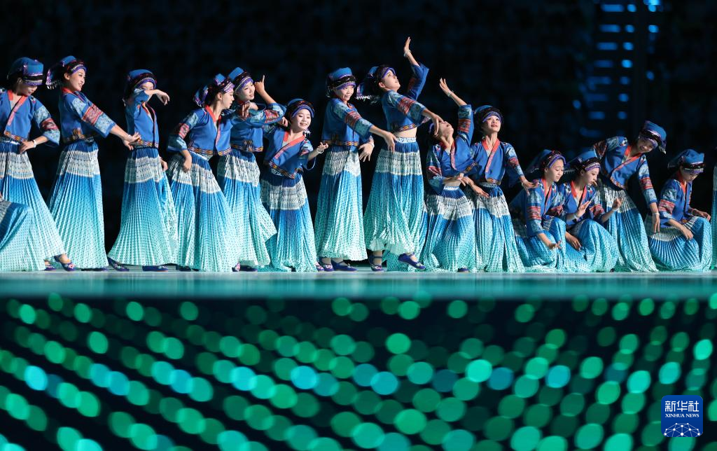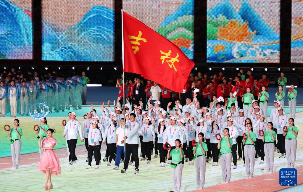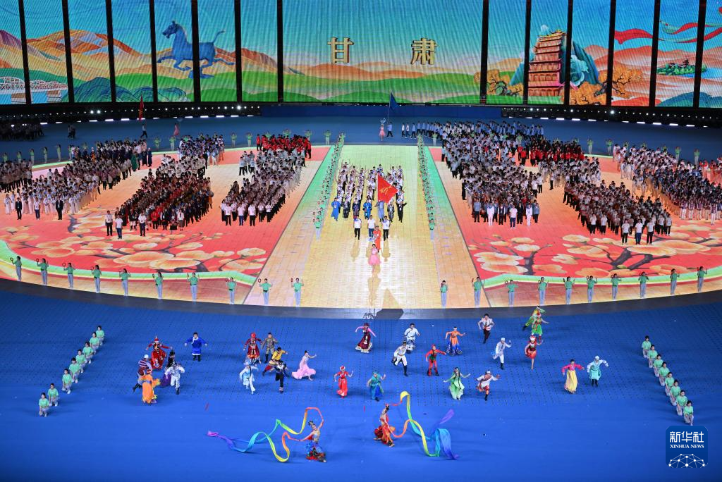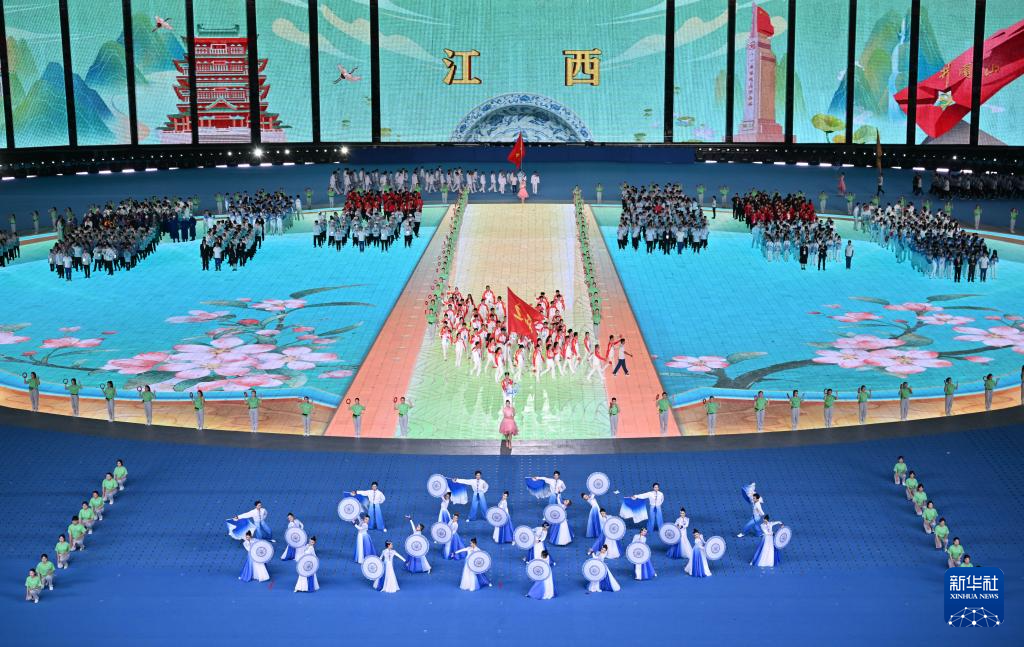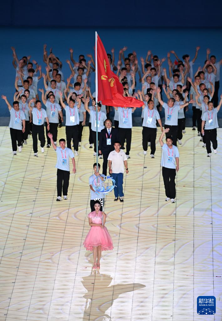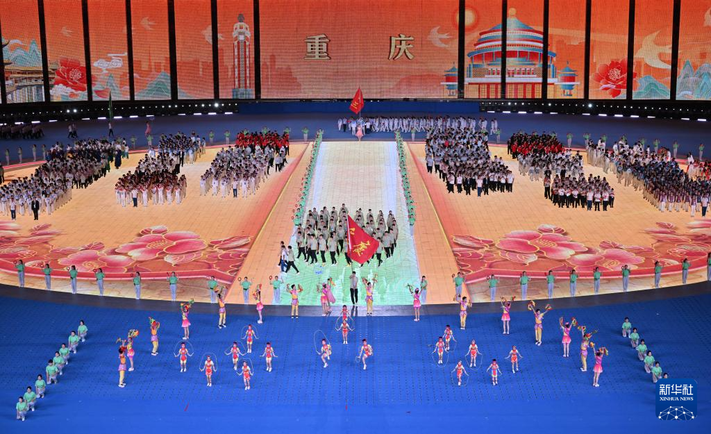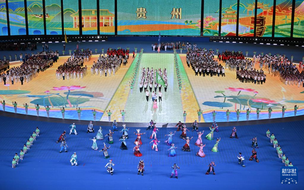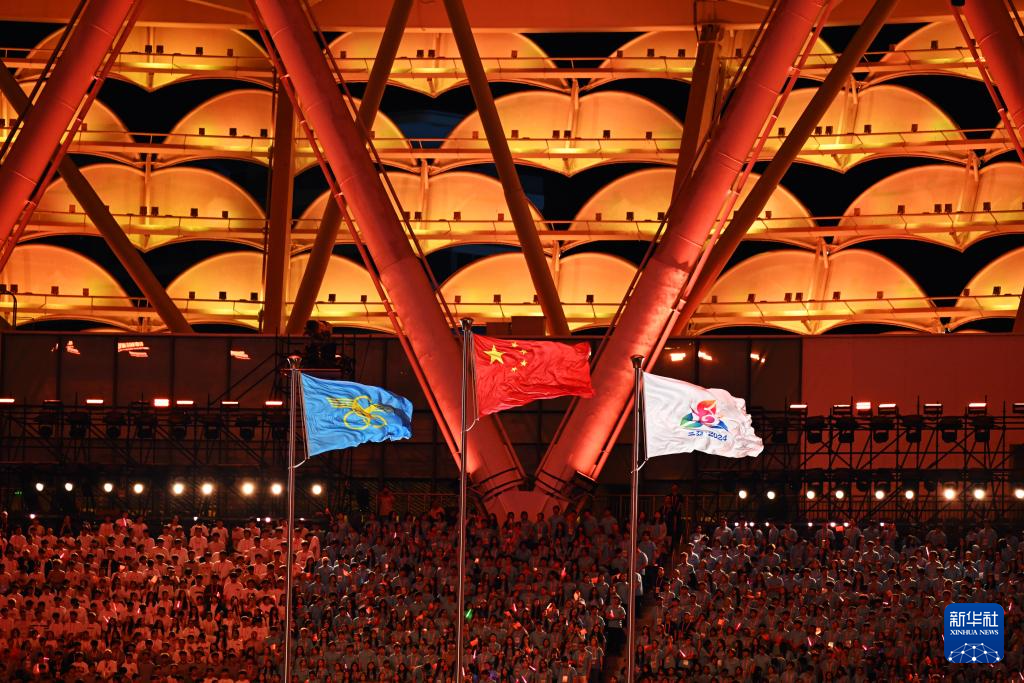 11月22日,開幕式現(xiàn)場升起中華人民共和國國旗、中華人民共和國少數(shù)民族傳統(tǒng)體育運動會會旗和中華人民共和國第十二屆少數(shù)民族傳統(tǒng)體育運動會會旗。
