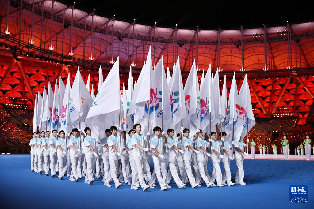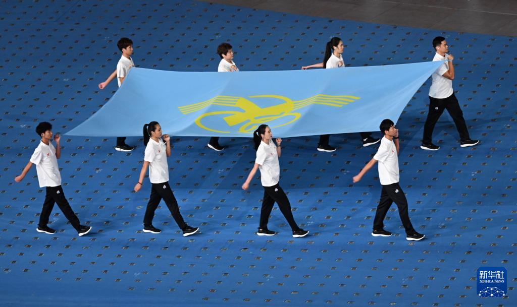 11月22日,中華人民共和國少數(shù)民族傳統(tǒng)體育運動會會旗在開幕式上入場。