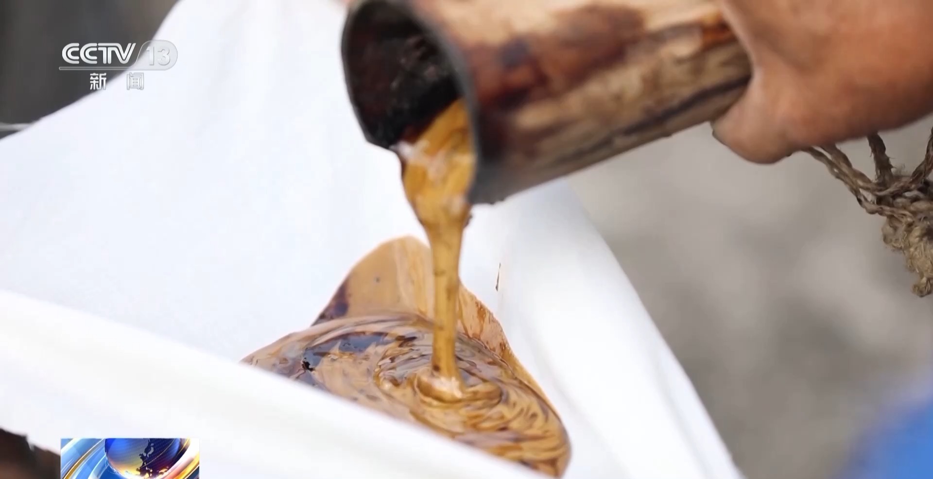 收割來(lái)的生漆,經(jīng)過(guò)濾渣、熬制、冷卻與桐油混合之后才能使用。