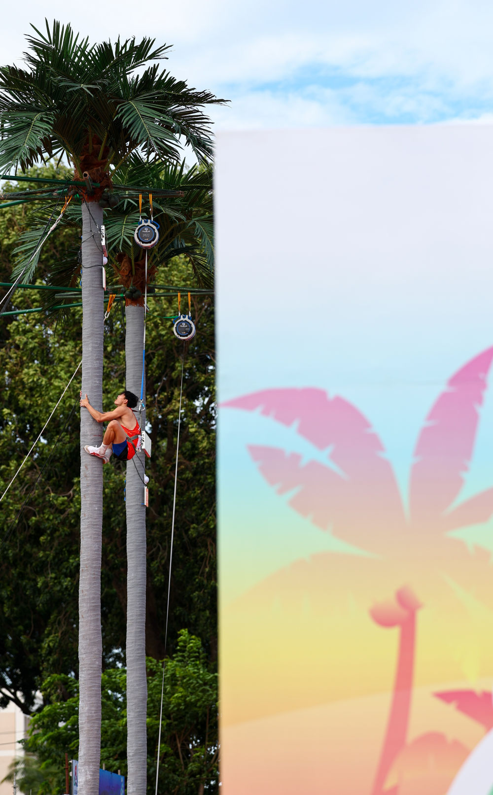 相比在運動會上歷史悠久的龍舟,當日上演的攀椰競速則是在本屆賽事首次撞入人們的眼簾。在椰子樹上手腳并用攀爬,迅速抵達頂端,不問可知,這一競技性與趣味性兼具的運動脫胎于海南當?shù)厝罕妭鹘y(tǒng)的徒手爬樹摘椰子場景。