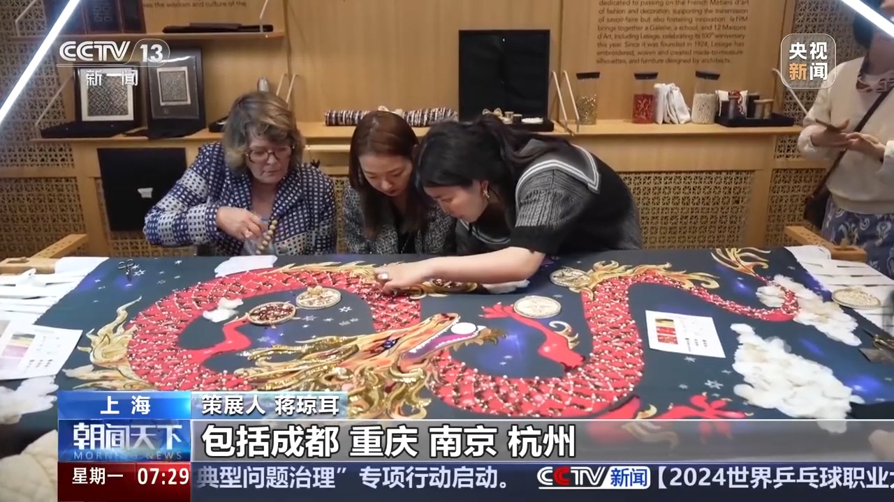 總臺(tái)央視記者 高媛:我身后這個(gè)不大的空間里擠滿了人,這里聚集了17個(gè)來自法國的品牌。它們展出的不只是產(chǎn)品,而是背后的工藝。精美的產(chǎn)品變成了一針一線的故事,觀眾還可以參與其中。