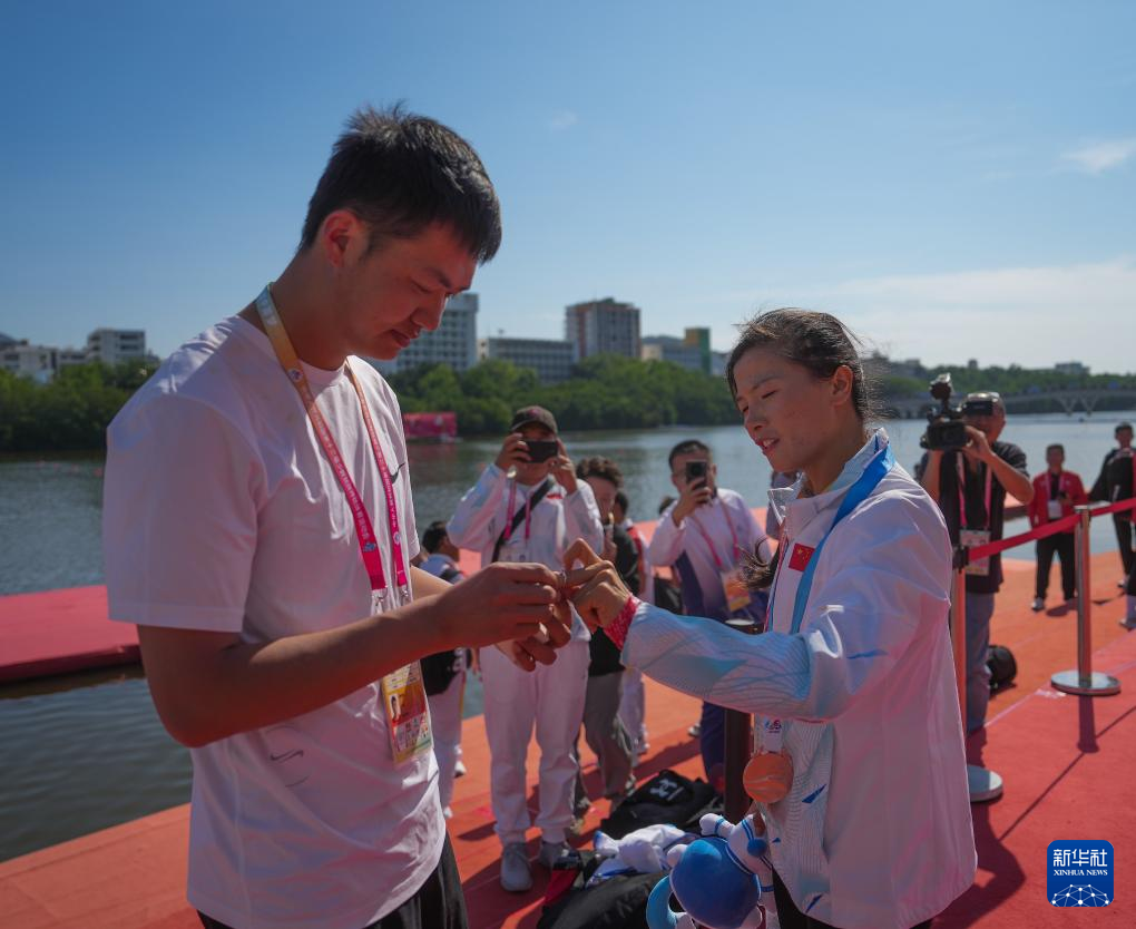 11月28日,何國潤(右)的男朋友向她求婚。當(dāng)日,在海南省三亞市舉行的第十二屆全國少數(shù)民族傳統(tǒng)體育運(yùn)動(dòng)會(huì)獨(dú)竹漂女子組200米直道賽頒獎(jiǎng)儀式后,海南隊(duì)選手何國潤的男朋友在頒獎(jiǎng)儀式現(xiàn)場向她求婚,上演溫情一幕。新華社發(fā)(杜笑微 攝)