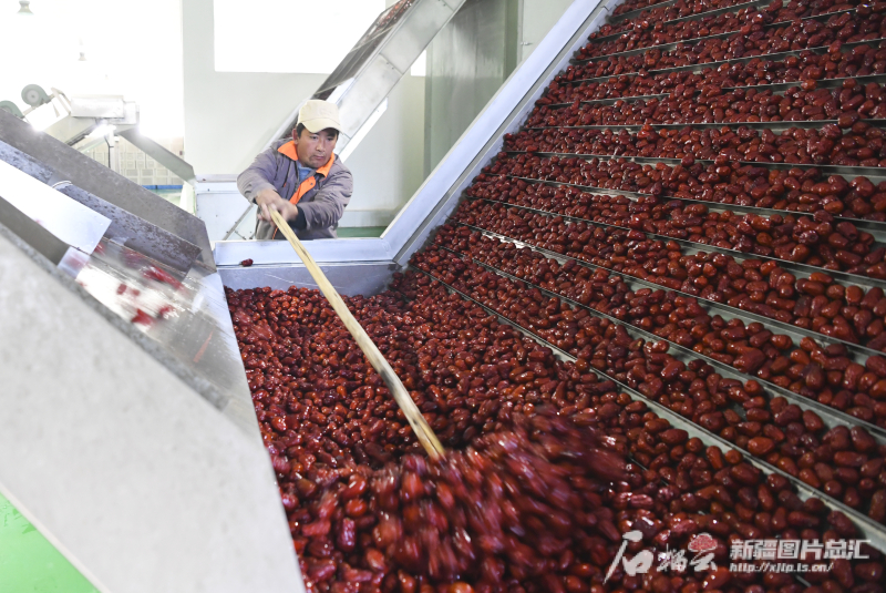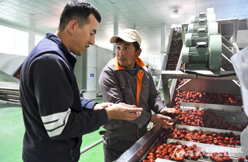 11月29日,策勒縣智慧果業(yè)農(nóng)民專業(yè)合作社員工在查看紅棗烘干情況。