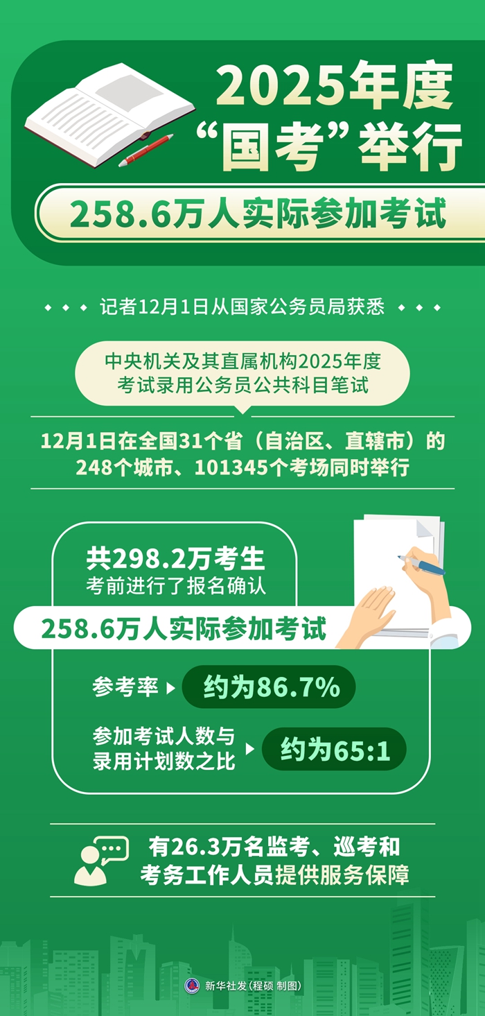 新華社北京12月1日電 記者1日從國家公務(wù)員局獲悉,中央機(jī)關(guān)及其直屬機(jī)構(gòu)2025年度考試錄用公務(wù)員公共科目筆試1日在全國31個?。ㄗ灾螀^(qū)、直轄市)的248個城市、101345個考場同時舉行,共298.2萬考生考前進(jìn)行了報名確認(rèn)、258.6萬人實際參加考試,參考率約為86.7%,參加考試人數(shù)與錄用計劃數(shù)之比約為65:1,有26.3萬名監(jiān)考、巡考和考務(wù)工作人員提供服務(wù)保障。