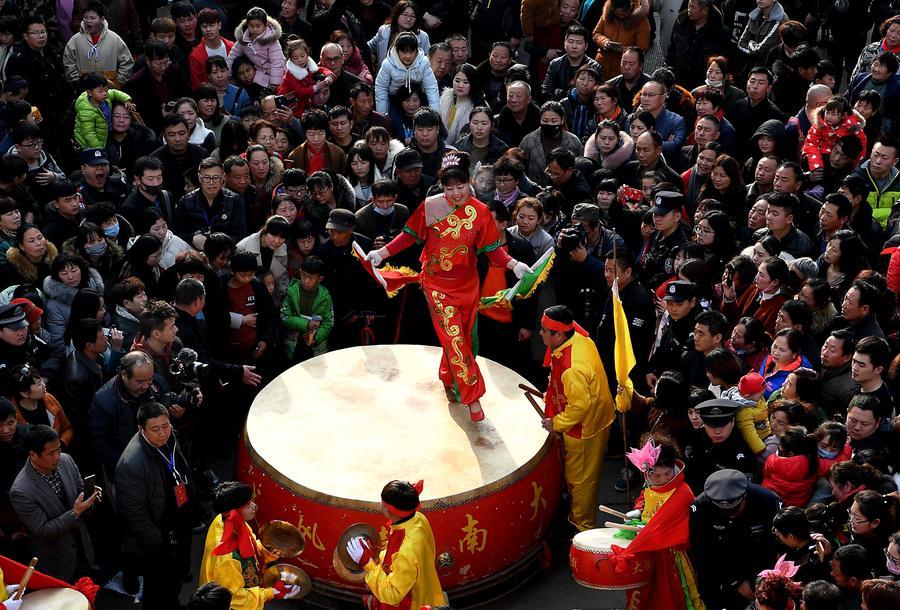 2018年3月2日,一支鑼鼓隊(duì)在河南??h古廟會(huì)上表演。 新華社記者 李安 攝