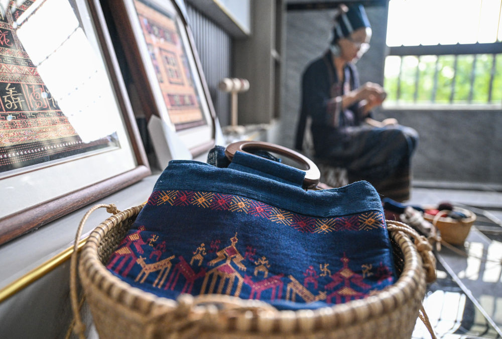 這是在海南省東方市東河鎮(zhèn)拍攝的黎族傳統(tǒng)紡染織繡技藝省級傳承人符永英用黎錦制作的手袋(2023年6月7日攝)。新華社記者 蒲曉旭 攝