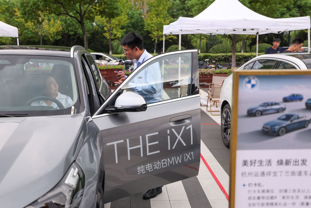 9月27日,經(jīng)銷商(右)在“美好生活 煥新出發(fā)”消費品以舊換新展會現(xiàn)場向消費者介紹車輛。(新華社記者 江漢 攝)