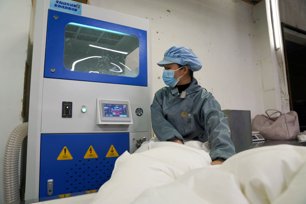 在橋圩鎮(zhèn)一家羽絨制品生產(chǎn)車間內(nèi),工人使用全自動(dòng)充絨機(jī)制作羽絨被。新華社記者 楊馳 攝