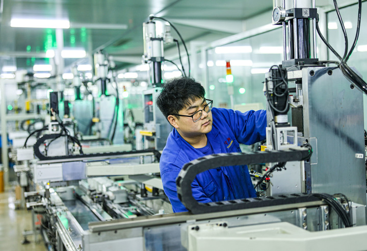 2024年12月12日,在山東省榮成市一家燃?xì)庥嬃績x表制造企業(yè)的智能化生產(chǎn)車間內(nèi),維修工人在進(jìn)行設(shè)備調(diào)試。新華社發(fā)(李信君攝)