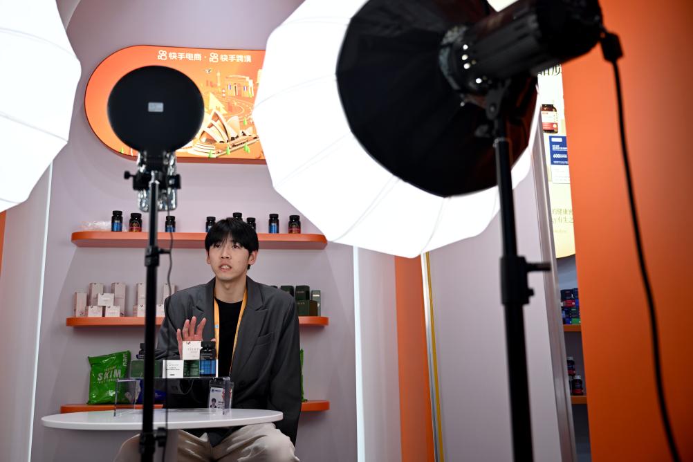 2024年11月5日,快手跨境主播在第七屆進(jìn)博會服務(wù)貿(mào)易展區(qū)直播。新華社發(fā)(陳浩明攝)