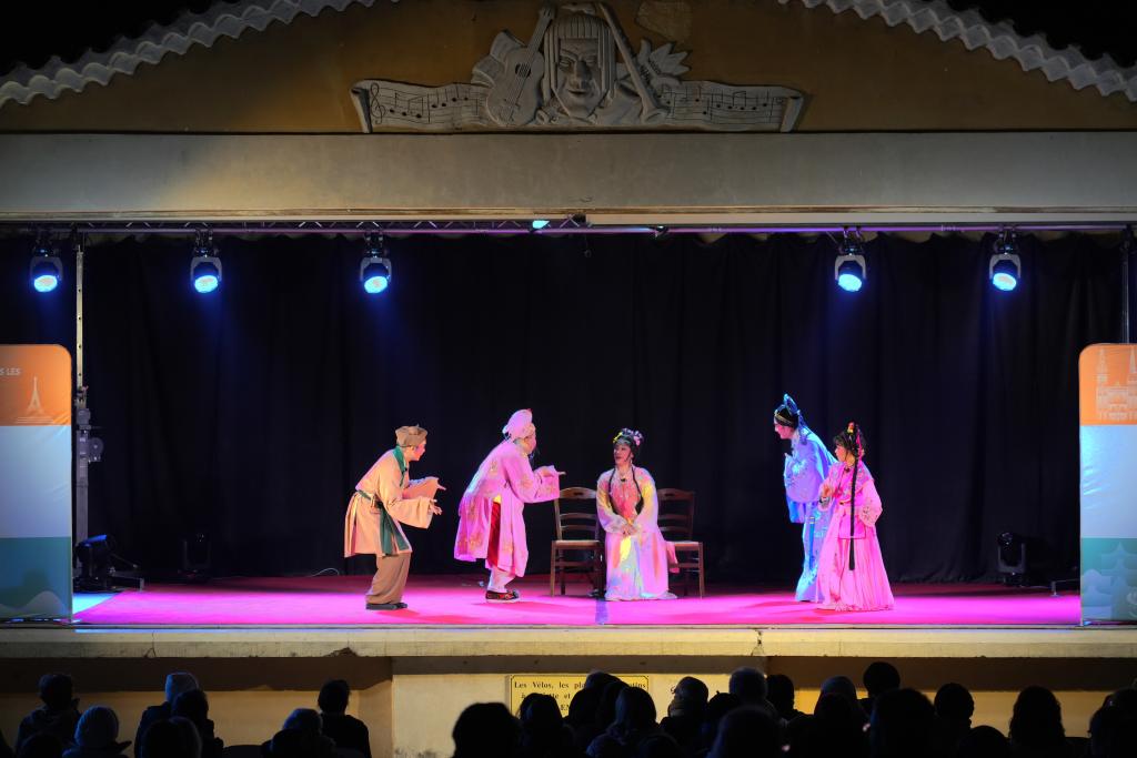 12月17日,在法國佩爾訥萊方丹,來自中國福建展演團的演員以高甲戲的形式演繹法國喜劇作家莫里哀代表作《吝嗇鬼》。(新華社記者 孫鑫晶攝)