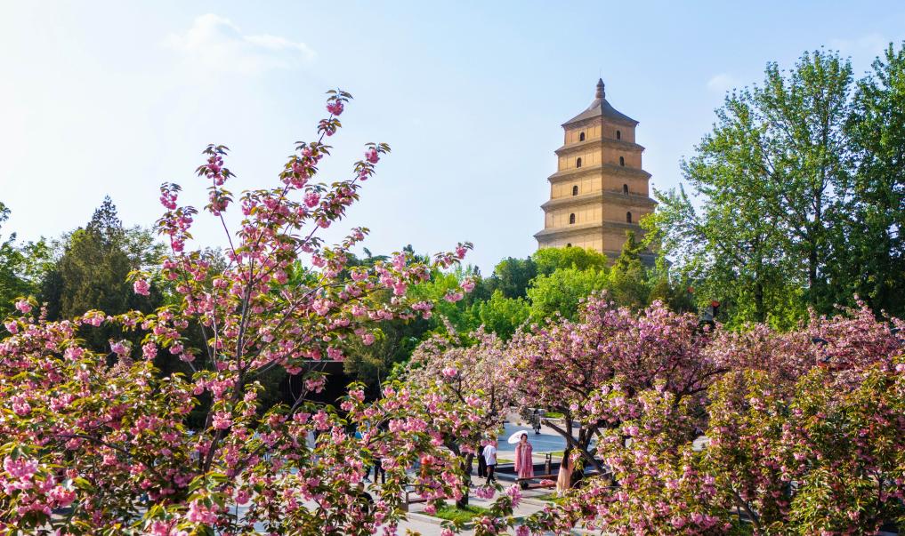 游客在西安大雁塔下游覽(無人機照片,2024年4月10日攝)。 新華社記者 鄒競一 攝