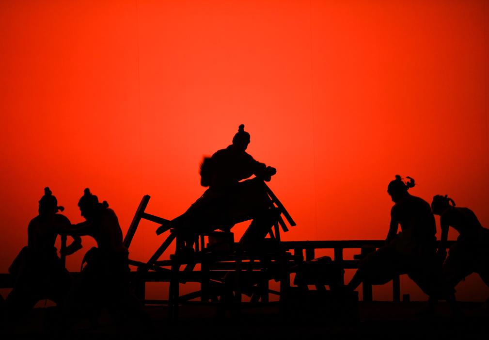 這是以“云夢睡虎地黑夫木牘”為靈感創(chuàng)排的大型歷史舞臺劇《赳赳大秦》演出現(xiàn)場(2024年9月25日攝)。 新華社記者 張博文 攝