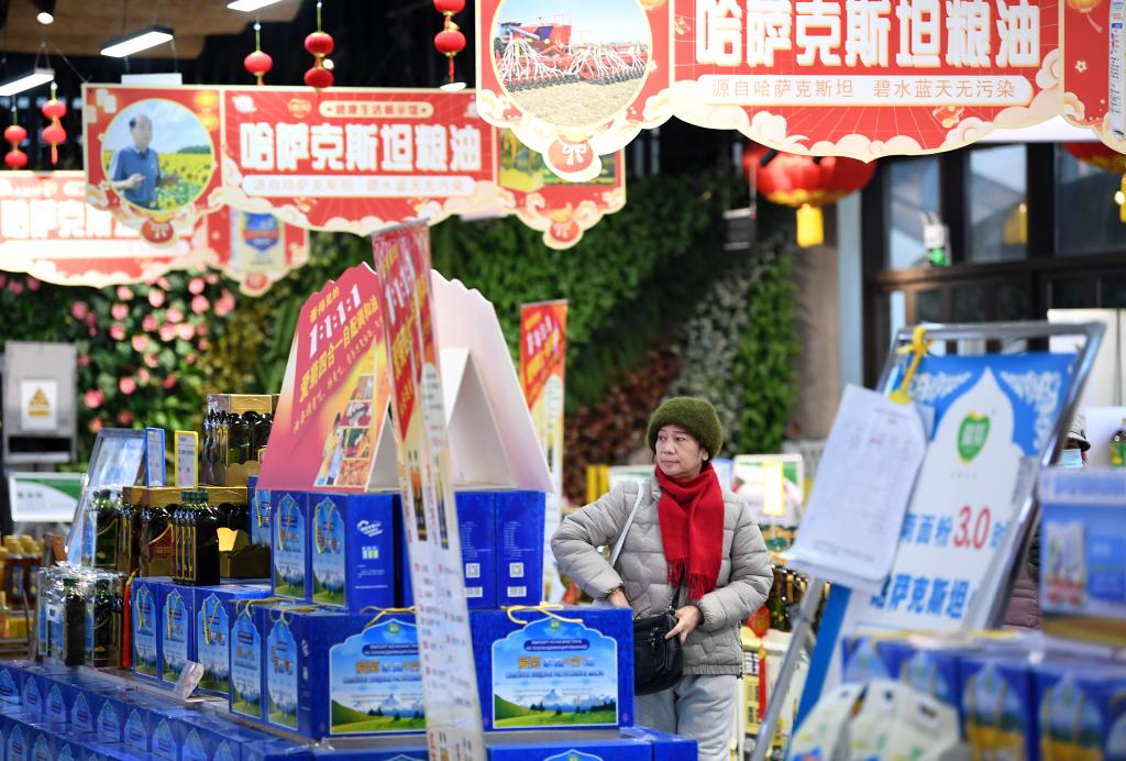 消費者在“中歐班列(西安)進口商品年貨節(jié)”上挑選哈薩克斯坦糧油產(chǎn)品(2024年2月1日攝)。 新華社記者 李一博 攝