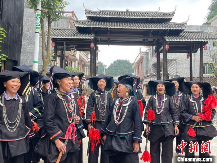 近日,在廣西那坡縣,“黑衣壯”民眾唱起山歌迎客?!↑S令妍 攝