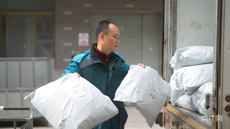 于雷正在企業(yè)廠區(qū)收取快遞件(央廣網(wǎng)記者 楊夢奎 攝)