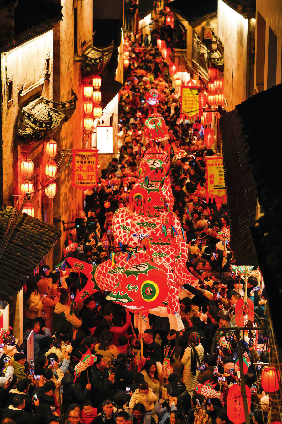在安徽省黃山市歙縣北岸鎮(zhèn)瞻淇村,村民舞動(dòng)非遺魚燈,吸引了眾多游客(2024 年 12 月 31 日攝) 施亞磊攝 / 本刊