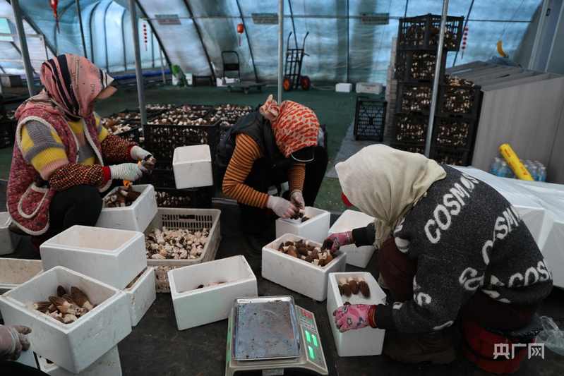 工人們將剛剛采收下來的羊肚菌剪根、裝箱(央廣網(wǎng)發(fā) 畢樂陶 攝)