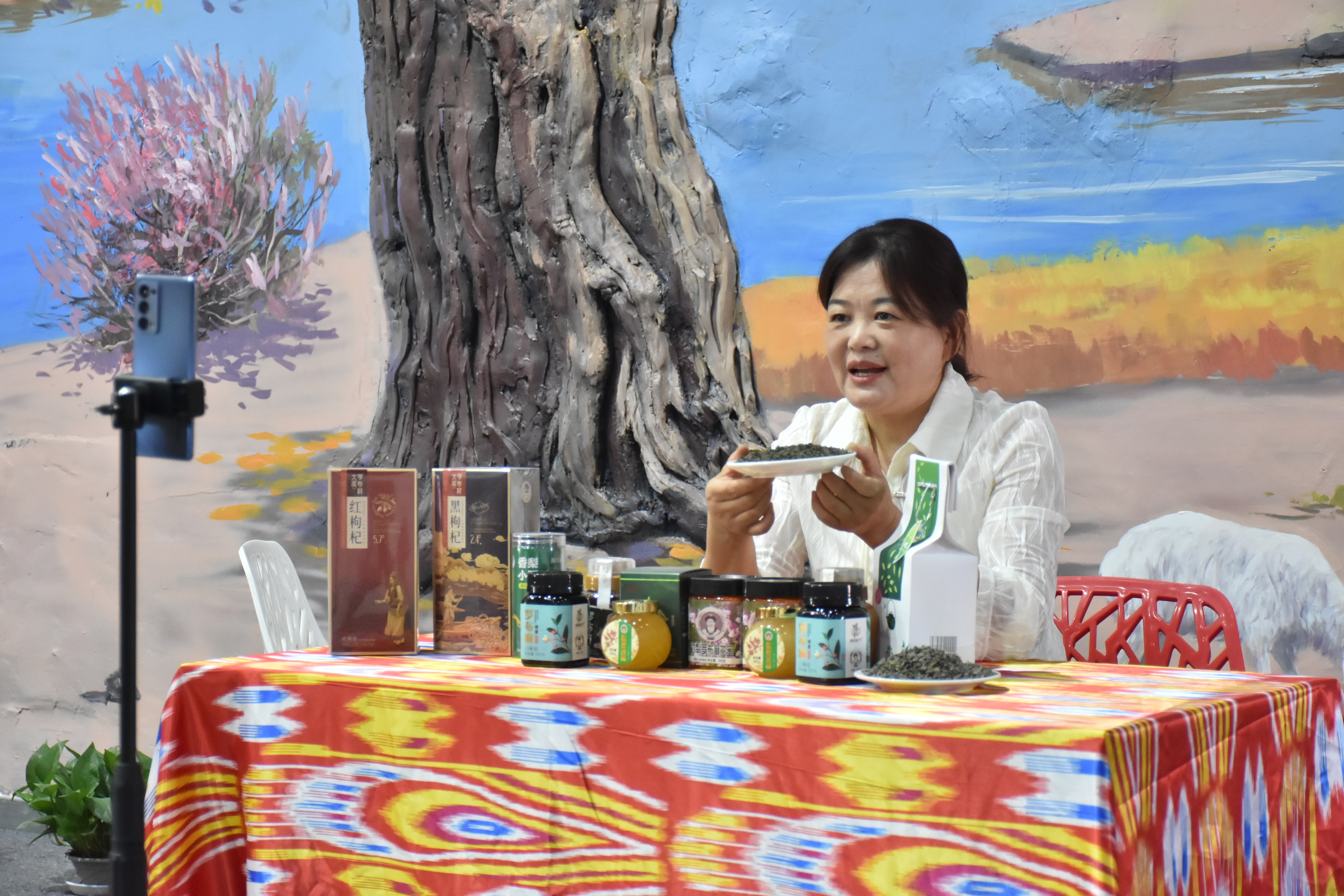 因為電商發(fā)展而受益的不只王曉紅。羅布麻茶、羅布麻蜜、尉犁小油馕、庫爾勒香梨、若羌紅棗、昆侖雪菊……走進(jìn)總面積近3000平方米的尉犁縣電商直播基地,100多種優(yōu)質(zhì)農(nóng)特產(chǎn)品整齊排列,不少主播正在直播。