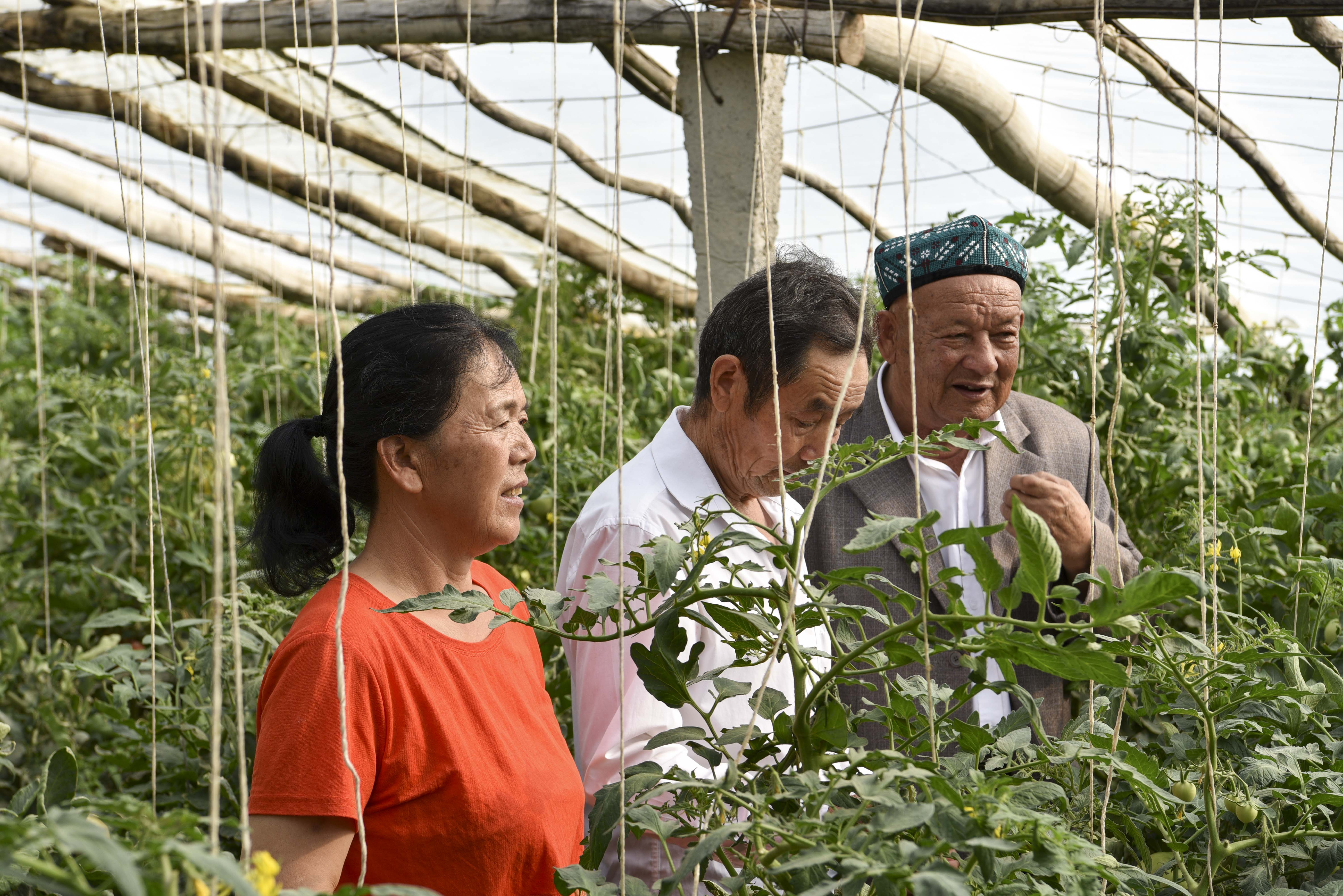 沙吾爾·芒力克(右一)和村民交流蔬菜種植經(jīng)驗。白佳麗 攝