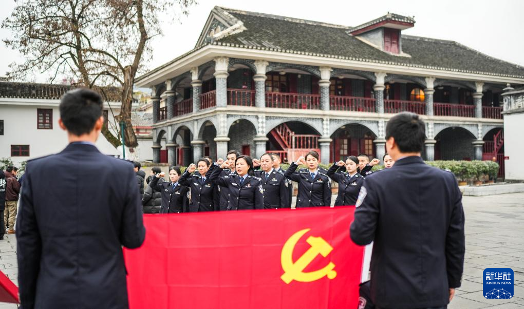 基層民警在遵義會議會址前重溫入黨誓詞(2025年1月7日攝)。新華社記者 陶亮 攝