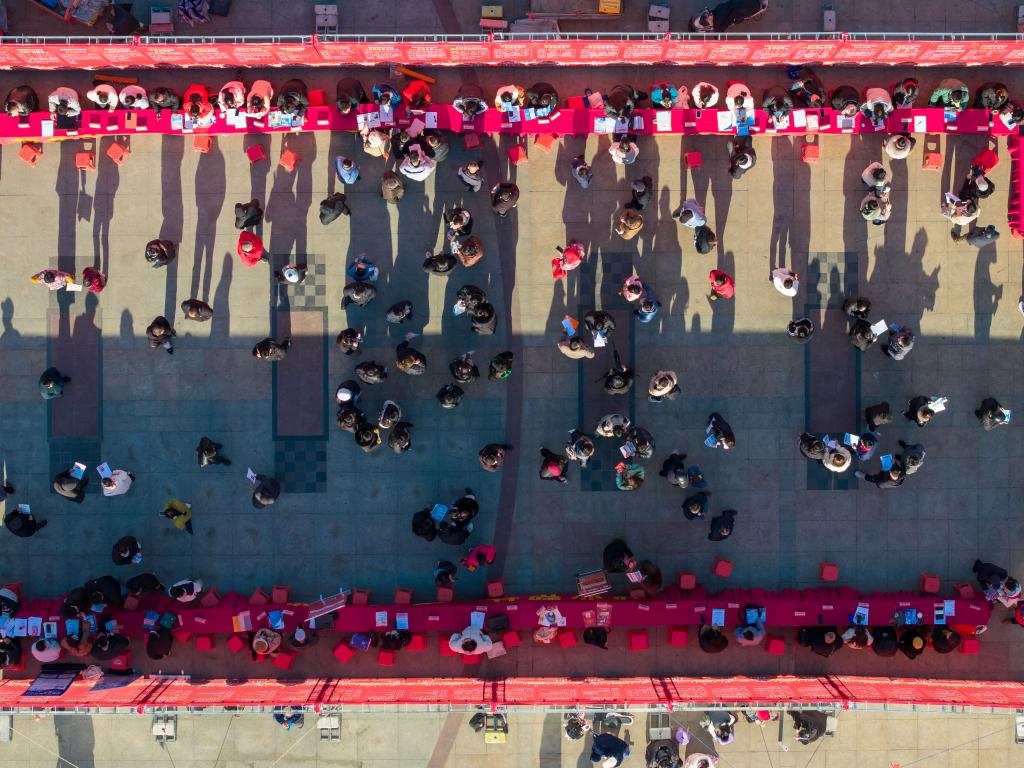 2025年1月15日,求職者在招聘會(huì)現(xiàn)場(chǎng)了解招聘信息(無(wú)人機(jī)照片)。新華社發(fā)(阮雪楓攝)