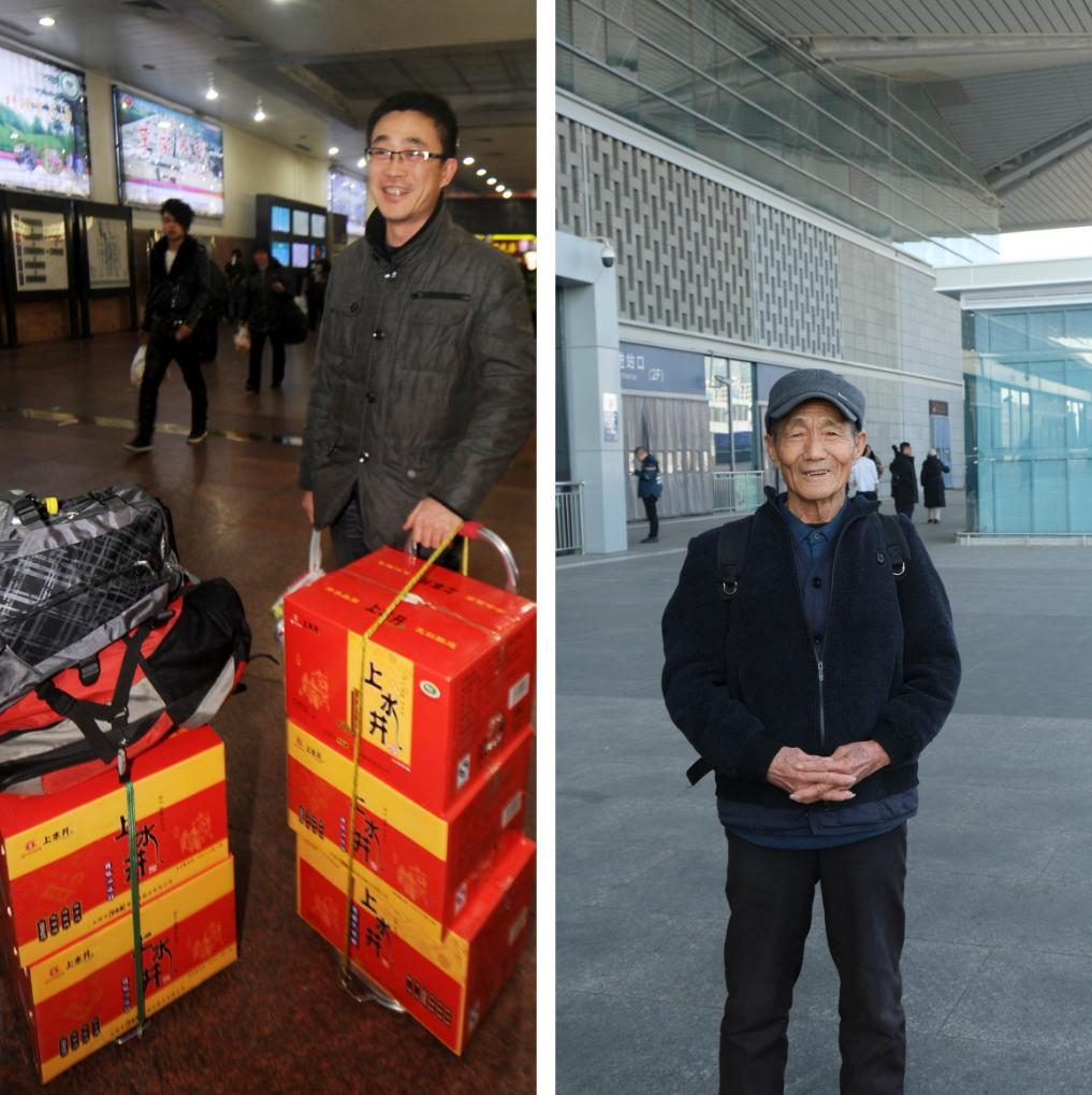 拼版照片。左圖為:2013年1月30日,來自內(nèi)蒙古包頭的徐長青在太原站候車,他買了五箱山西老陳醋帶回家(新華社記者燕雁攝);右圖為:2025年1月18日,在太原南站,一位老人背著一個雙肩包輕松返鄉(xiāng)(新華社記者王學濤 攝)。新華社發(fā)