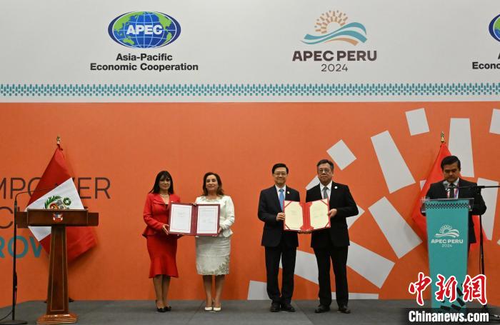 2024年11月15日,亞太經(jīng)合組織第三十一次領(lǐng)導(dǎo)人非正式會(huì)議期間,中國香港與秘魯在秘魯利馬簽署自由貿(mào)易協(xié)定。圖為秘魯總統(tǒng)博魯阿爾特(左二)、秘魯外貿(mào)旅游部部長萊昂(左一)、香港特區(qū)行政長官李家超(右三)、香港特區(qū)政府商務(wù)及經(jīng)濟(jì)發(fā)展局局長丘應(yīng)樺(右二)完成簽署后合影。 香港特區(qū)政府新聞處供圖