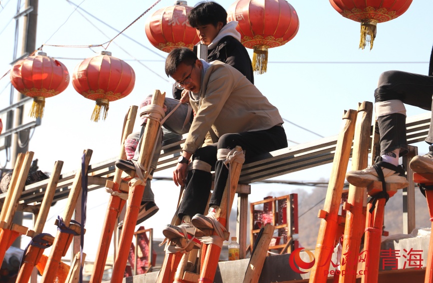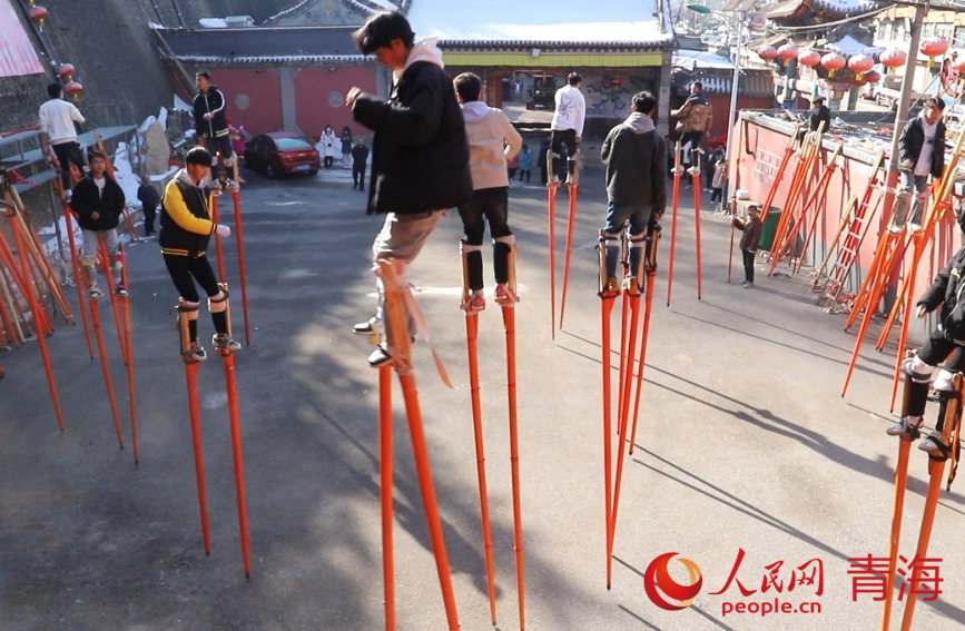 綁蹺、試蹺、定蹺……青海省西寧市湟中區(qū)魯沙爾鎮(zhèn)火神廟,魯沙爾高蹺隊迎來了春節(jié)前最后一次排練。“從臘月初一到現(xiàn)在二十多天了,今年大家積極性很高,報名的人也多,排練效果不錯?!弊龊脺?zhǔn)備,隨著社火音樂的鼓點舞動起來,魯沙爾鎮(zhèn)高蹺協(xié)會會長李玉龍站在臺階上看著排練隊形。