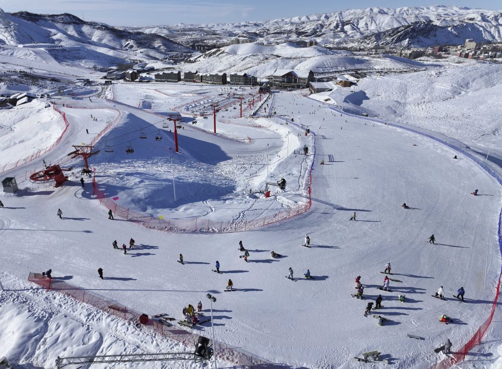 1月24日,游客在阿勒泰市將軍山國際滑雪度假區(qū)滑雪(無人機照片)。