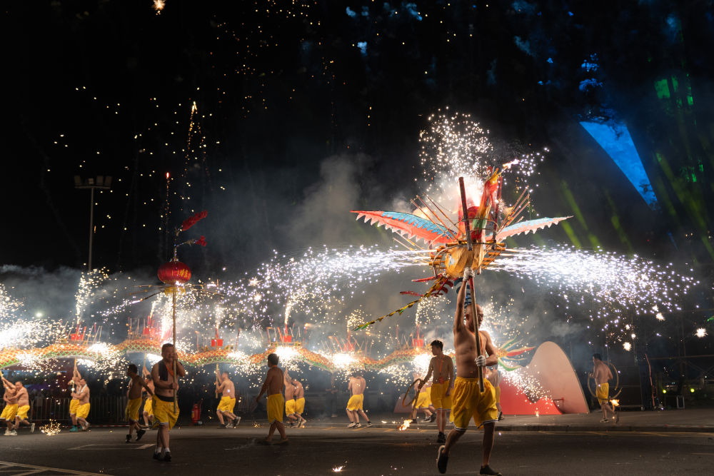 夜幕降臨,點(diǎn)燃觀眾熱情的不僅只有英歌舞。在客家文化的重要發(fā)源地梅州,埔寨火龍表演現(xiàn)場(chǎng)火光沖天,龍影翻騰。