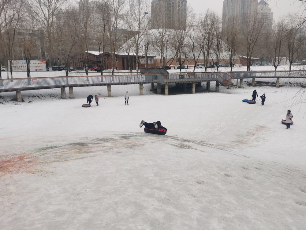 在哈爾濱湘江公園,28日一早,10歲的黃梓天就和爸爸一起來玩雪圈。這處公園里形成的自然雪坡,每年冬季都成為市民滑雪圈的好去處?!霸缟虾⒆右獊?,就帶著過來玩一會(huì),也是一種過年的方式?!秉S梓天的父親黃文說。