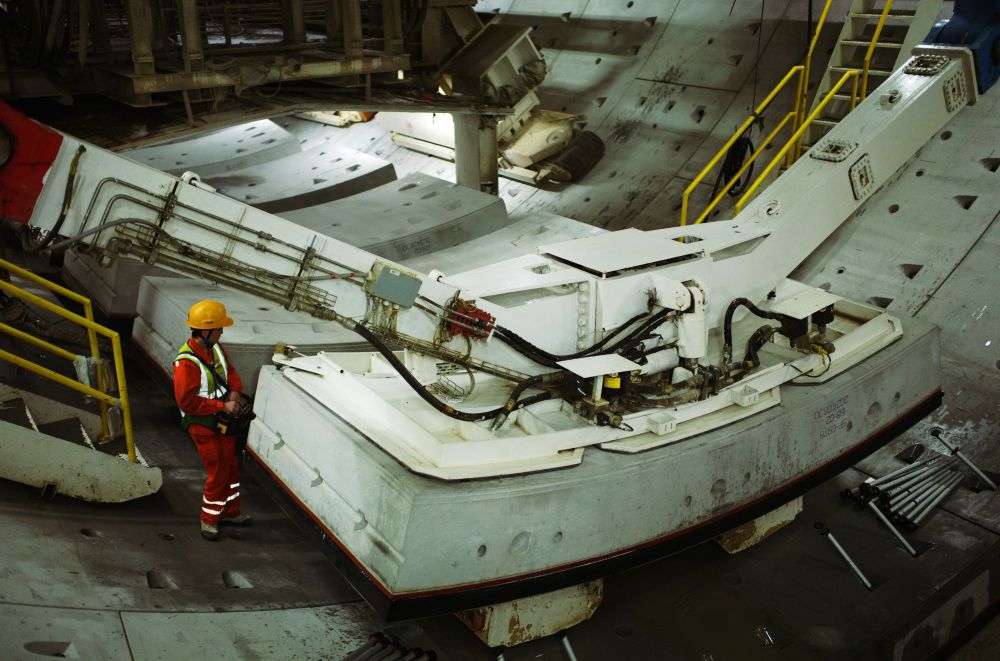點點“星光”盡頭,拼裝班長周洪強操作伸縮機,將一塊隧道管片緩緩抓起。穩(wěn)穩(wěn)平移、旋轉(zhuǎn)過后,12噸重的管片精準(zhǔn)落位。
