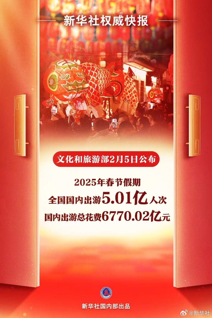 2月5日,文化和旅游部公布春節(jié)假期最新數(shù)據(jù):春節(jié)假期8天,全國國內(nèi)出游5.01億人次,同比增長5.9%;國內(nèi)出游總花費6770.02億元,同比增長7.0%。全國出游人次和總花費再創(chuàng)新高!