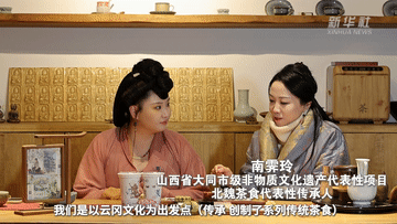 在云岡石窟景區(qū)內(nèi)的一家北魏茶食非遺體驗(yàn)店內(nèi),游客們正品嘗、購(gòu)置著各式各樣的傳統(tǒng)茶食。