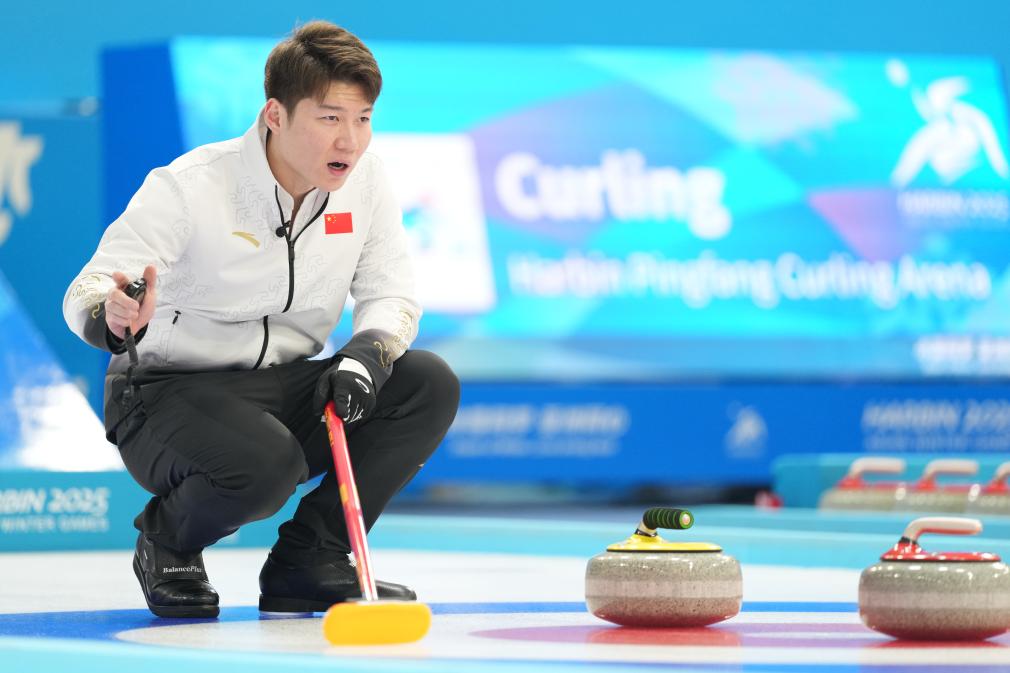 2月6日,中國(guó)隊(duì)選手王智宇在比賽中指揮隊(duì)友擦冰。當(dāng)日,在哈爾濱舉行的第九屆亞冬會(huì)冰壺混雙循環(huán)賽B組第6輪比賽中,中國(guó)隊(duì)6比4戰(zhàn)勝韓國(guó)隊(duì)。新華社記者 王松 攝