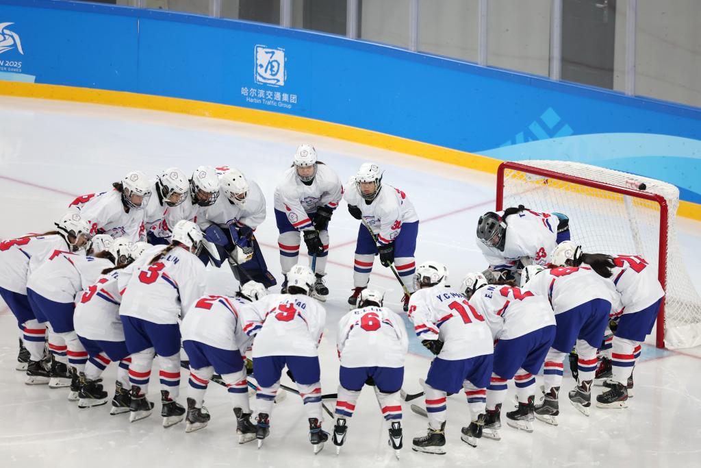 2月6日,在哈爾濱體育學(xué)院舉行的2025年第九屆亞冬會女子冰球小組賽B組比賽中,中國臺北隊1:5不敵哈薩克斯坦隊。新華社記者 孫非 攝