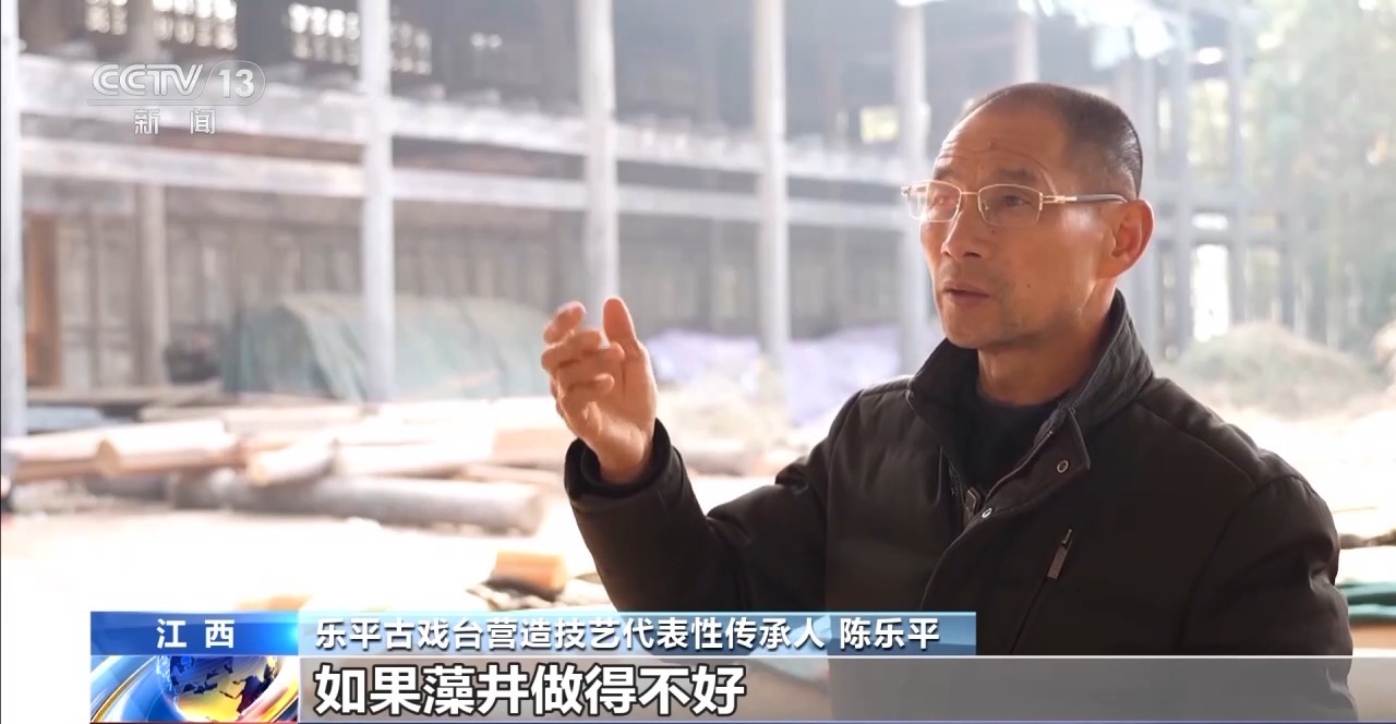 樂平古戲臺營造技藝非遺傳承人 陳樂平:古代人做螺旋頂,做得越好的,回音就響亮。如果藻井做得不好,古代沒有擴音器,做得不好回音就回不出來。