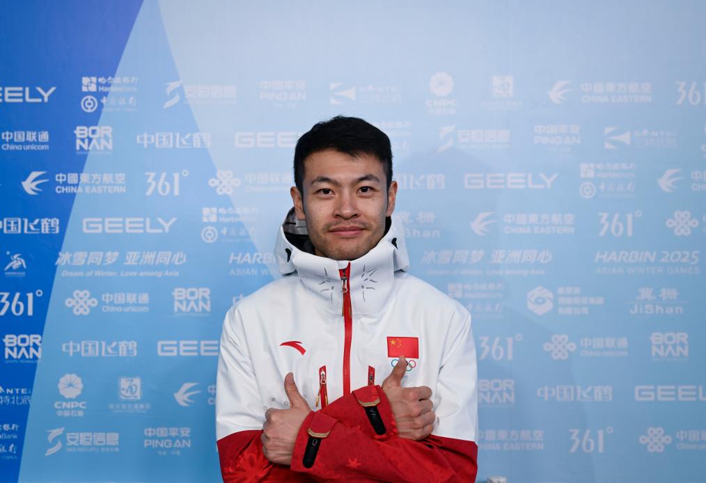 2月6日,哈爾濱亞冬會(huì)開(kāi)幕式中國(guó)體育代表團(tuán)旗手寧忠?guī)r在黑龍江省冰上訓(xùn)練中心速滑館接受集體采訪。新華社記者 陳振海 攝