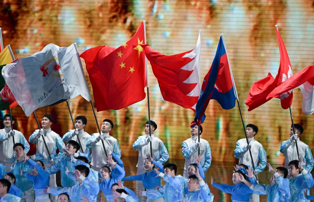 這是2月14日拍攝的各體育代表團入場環(huán)節(jié)。當(dāng)日,第九屆亞洲冬季運動會閉幕式在哈爾濱舉行。新華社記者 黃博涵 攝