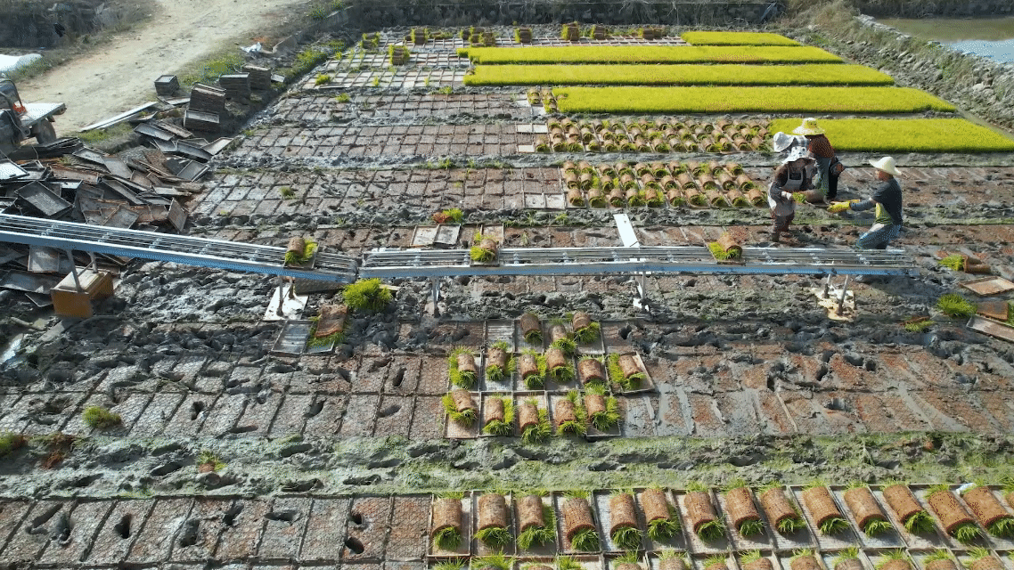 2025年2月13日,云南省西雙版納傣族自治州勐??h,農(nóng)民把傳輸帶上的秧苗搬運(yùn)到車(chē)上。(新華社記者 王賢思攝)