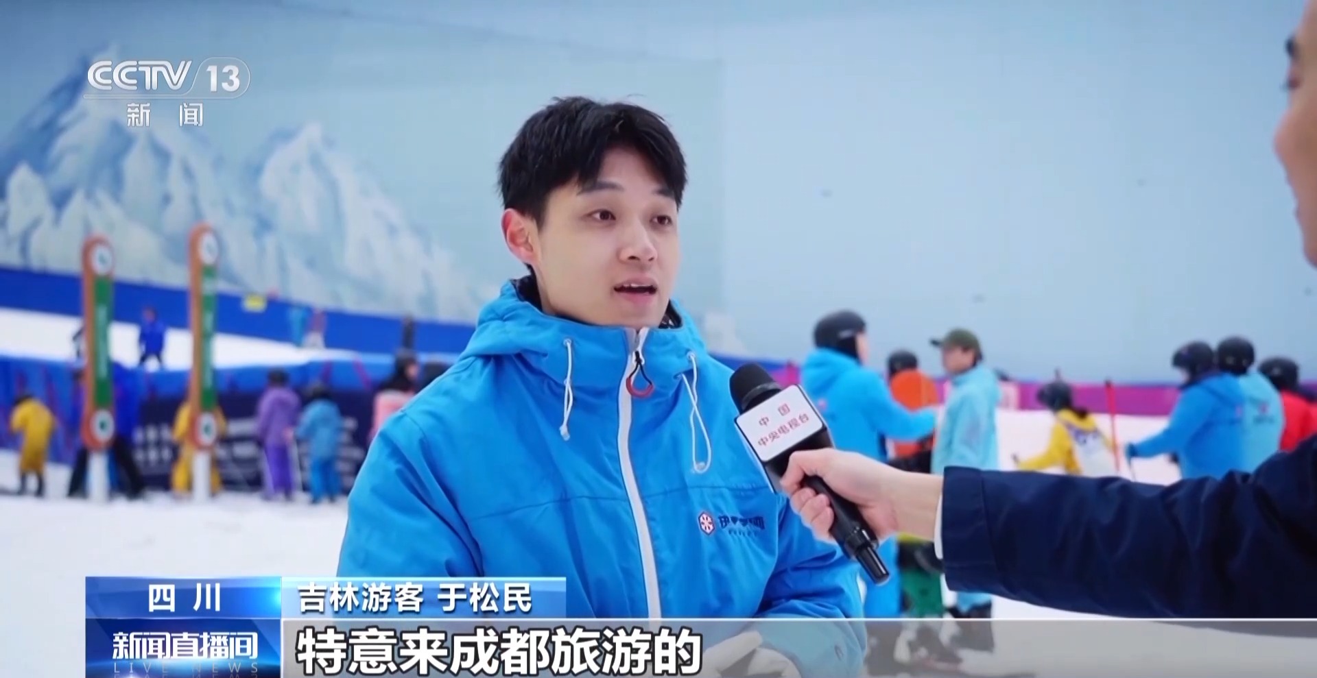 吉林游客 于松民:我是從吉林來的,特意來成都旅游的。然后就想特意體驗(yàn)一下成都市內(nèi)的滑雪場,沒有想到今天在這兒看到這么大的一個滑雪場。